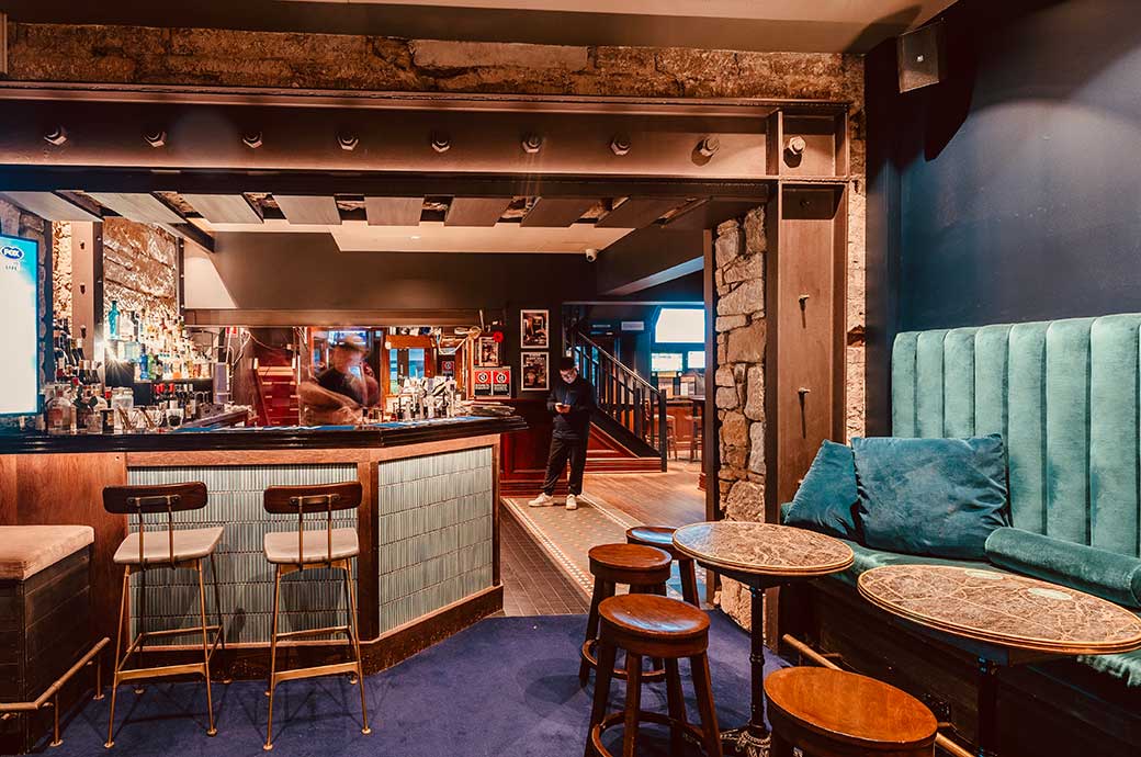 Numerous heritage elements were meticulously restored during the renovations. Concrete render was removed to unveil the original Pyrmont Sandstone slabs, which form the external walls and enhance the building’s notable streetscape. The original awning was carefully reconstructed and reconditioned. Sandstone blocks salvaged during the renovation were creatively repurposed to form a striking steel arch between the bar and cocktail area, creating a three-quarter height enclosure that celebrates the building’s history and provides a welcoming space for guests.
